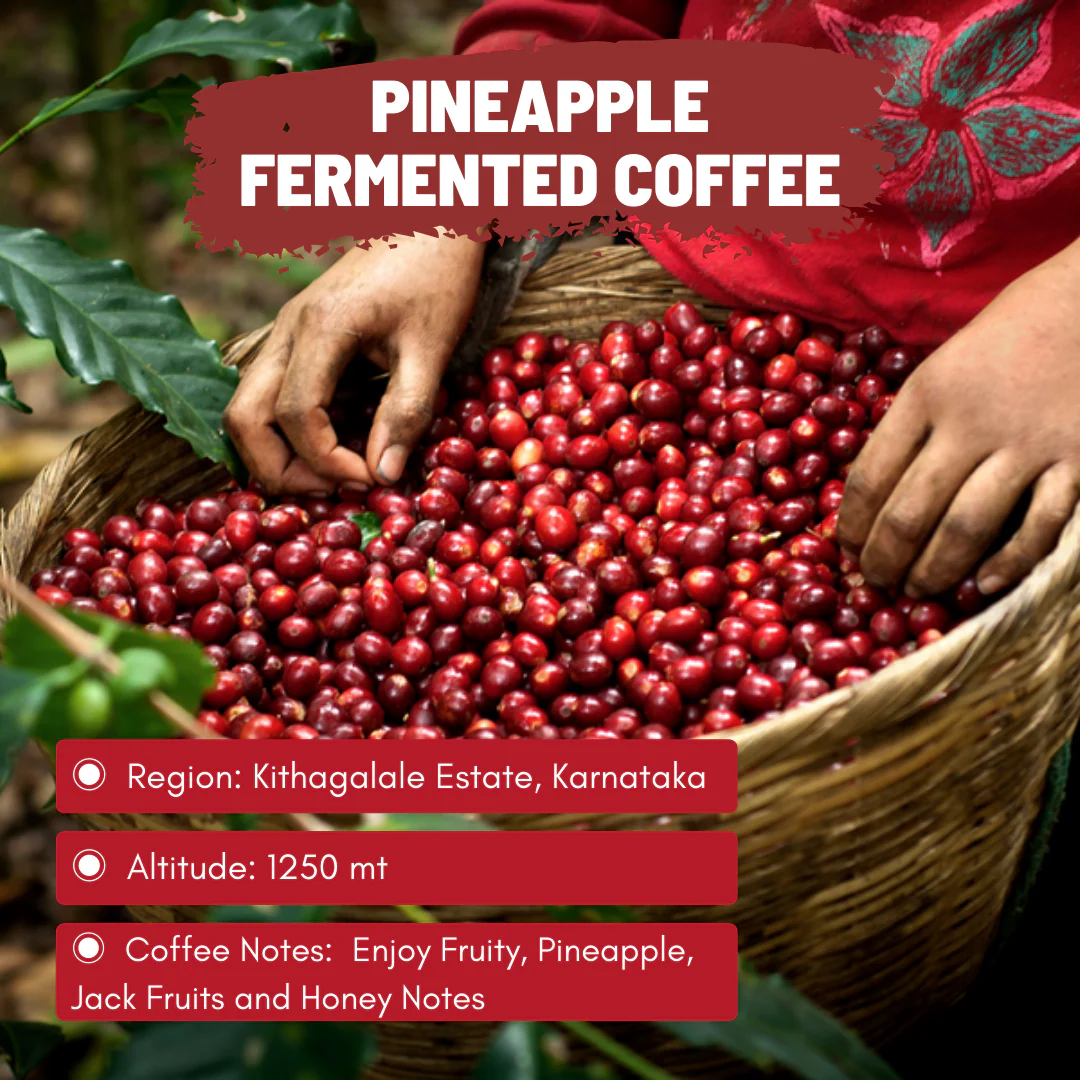 Experience the elegance of the unique fermentation process wherein selectively sourced Arabica Beans are fermented with Pineapple pulps for 4-5 days. Fermentation refines the sweetness, body, and acidity of the coffee and adds a fruity note to it.