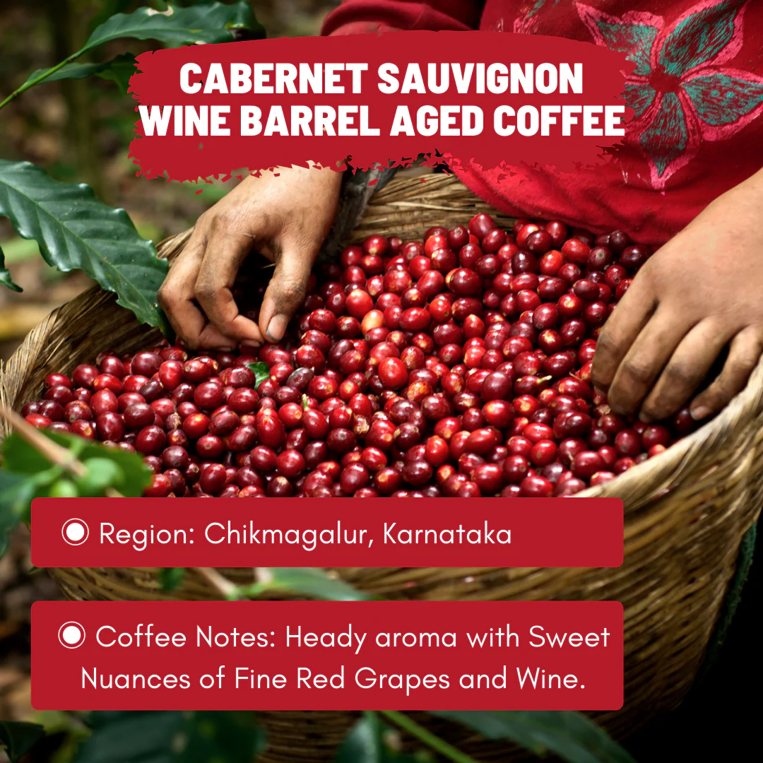 The Deepest Coffee Expertise Meets the legacy of world’s most recognised Red Wine : Cabernet Sauvignon. For our latest barrel-aged coffee, we used an extraordinary lot of selectively sourced coffee from highest hills of Karnataka, tended carefully throughout the ageing process in Cabernet Sauvignon Wine Barrel. The result is a Showstopper, a cup that has a heady aroma with sweet nuances of fine red grapes and wine. A mingling of Coffee and traditions.
