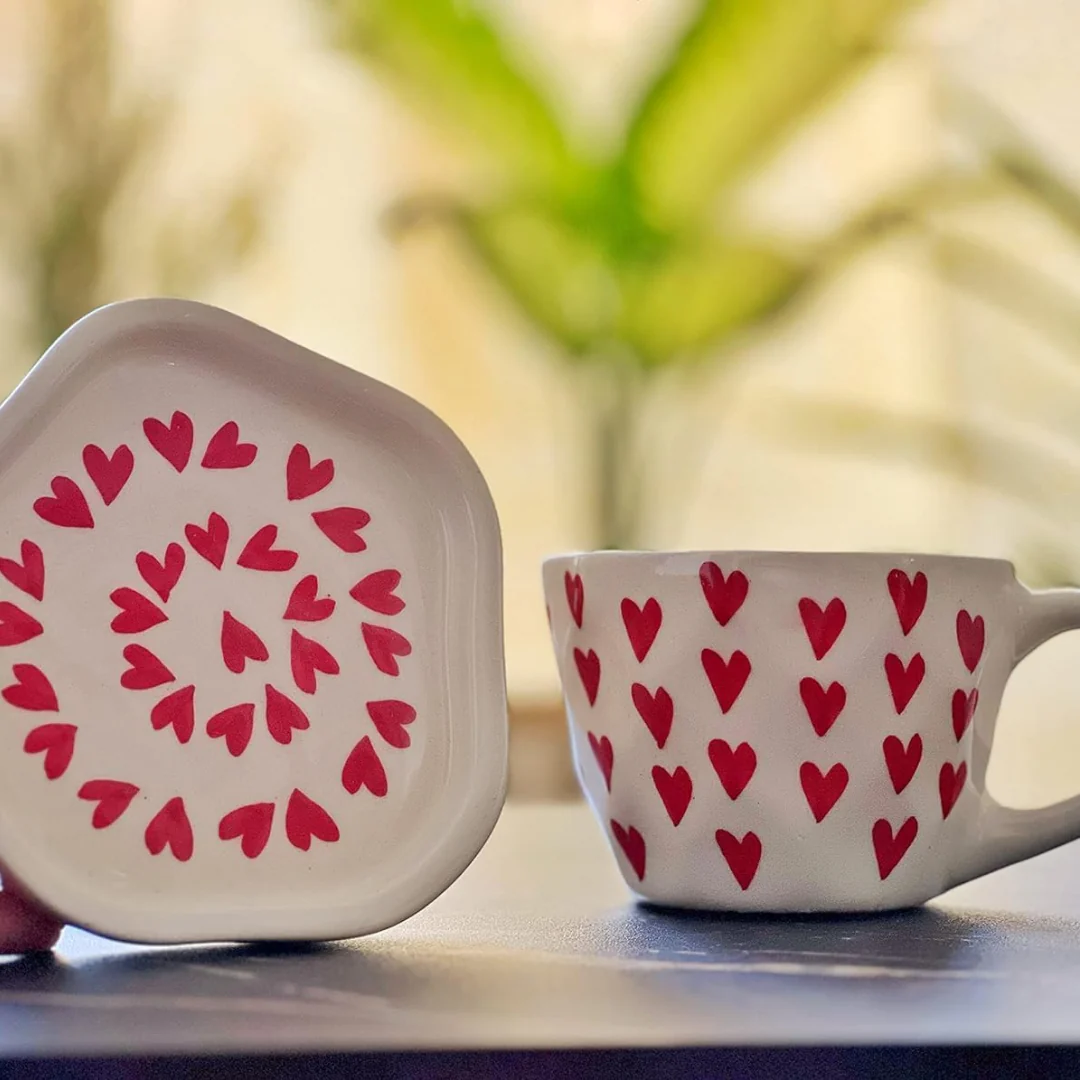A heartwarming addition to your morning routine, this handmade ceramic coffee mug features a delightful design of red hearts on a charming backdrop.