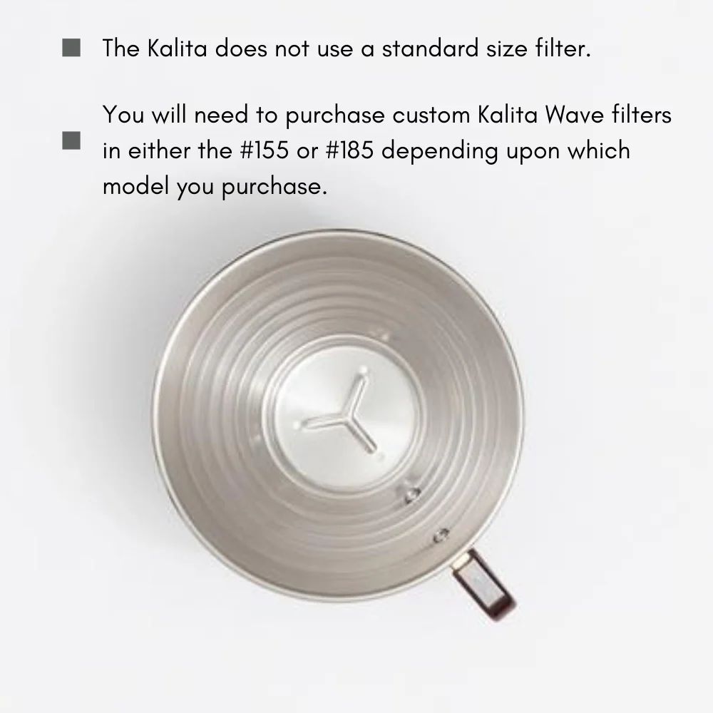 Kalita Wave dripper will help anyone easily make a delicious cup of coffee regardless of your pouring technique. Drippers are either made of heat-resistant glass or Stainless Steel. Kalita Wave 155 filters compatible with the 155 dripper and Kalita Wave 185 filters are compatible with the 185 dripper.