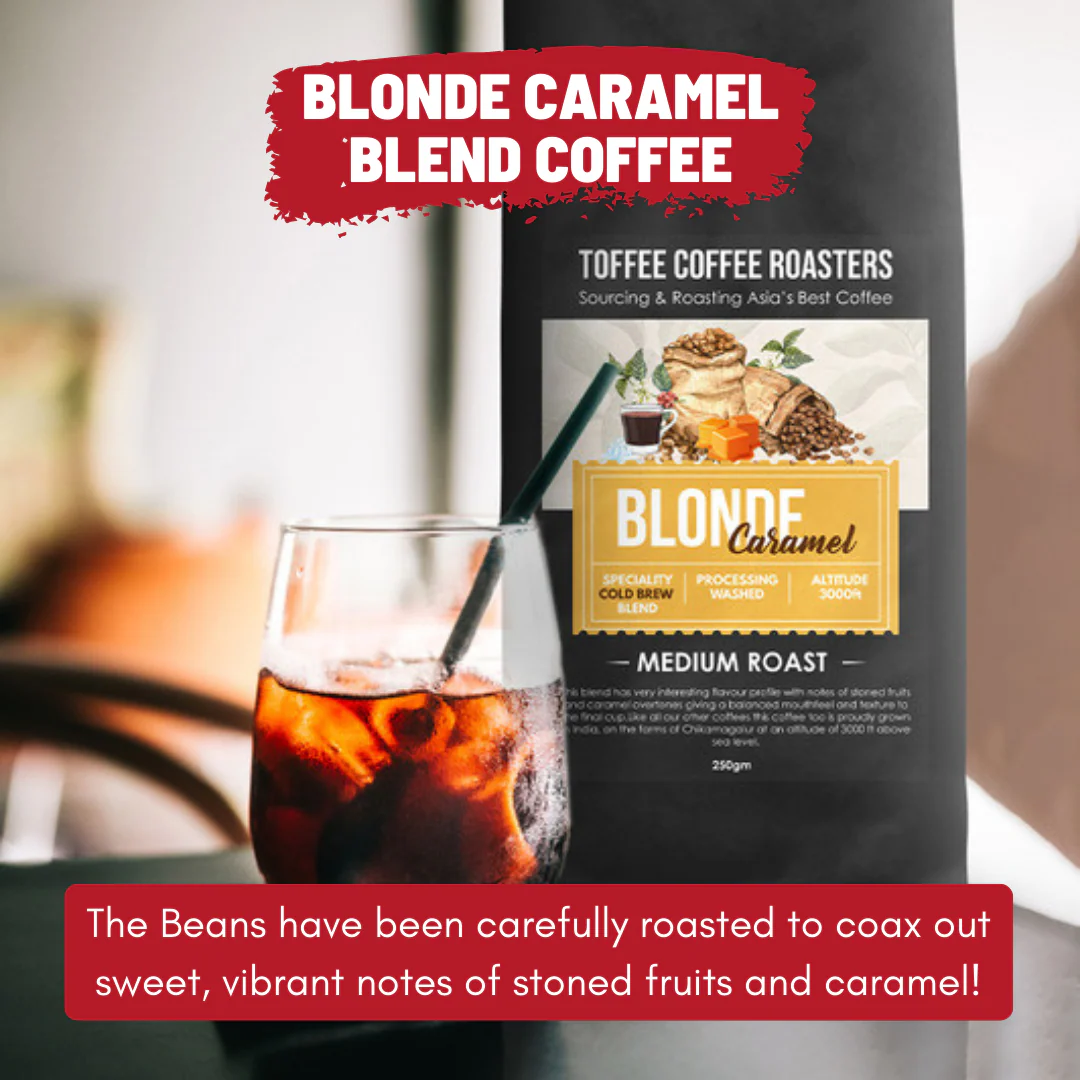 - Blonde Caramel Coffee (Medium Roast): Experience the richness of freshly roasted coffee with a hint of Caramel. Brew it Hot or Cold and it’s refreshing, and 100% delicious, every time! Coffee Notes: Experience Stoned Fruits and Caramel Overtones giving a mouthfeel and texture to the final cup. This Medium Roast , Natural processed coffee stands out with interesting fruity notes and sweet aroma in the cup.